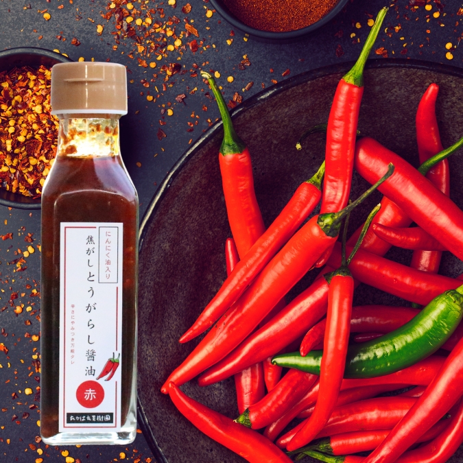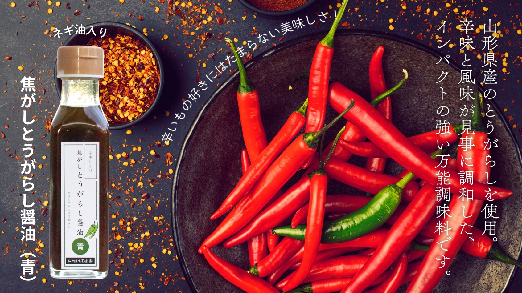 『焦がしとうがらし醤油』は、山形産のとうがらしを使用した、辛味、風味のバランスが調和したインパクトの強い万能調味液シリーズです。