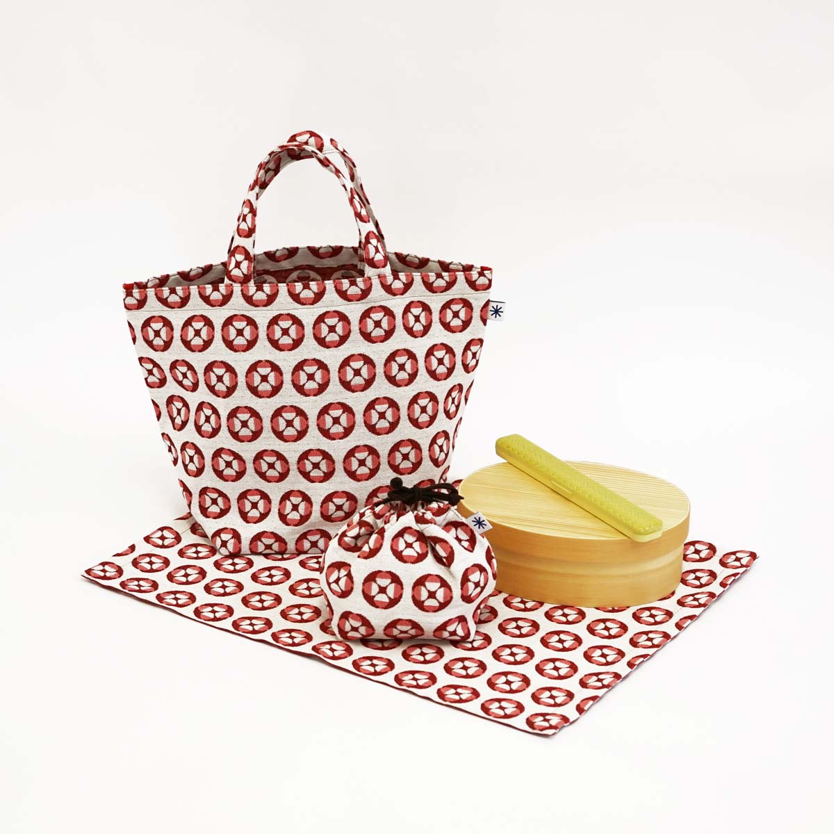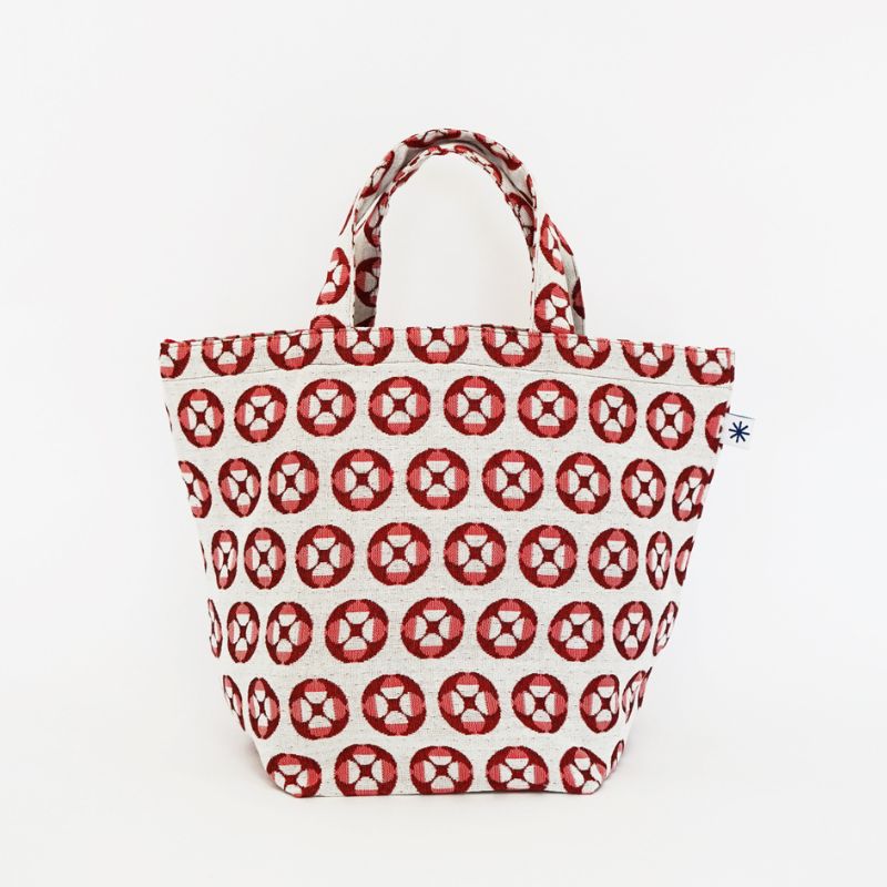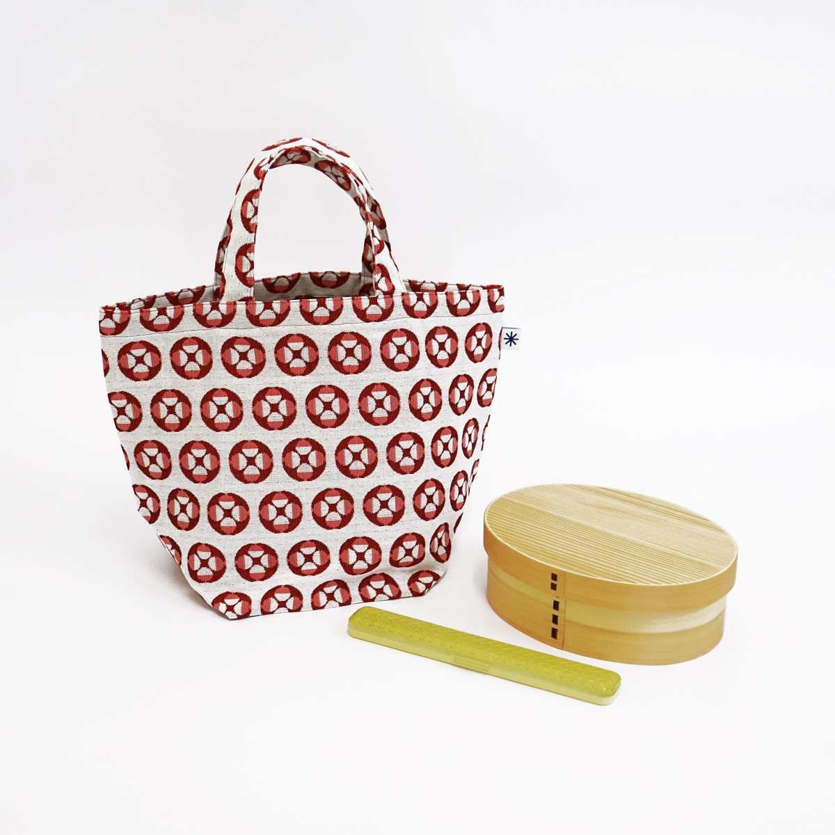 お弁当箱を持ち運ぶのに最適な、しっかりとした帆布に近い厚みの織物バッグ。持ち手までしっかりと米織生地で作られており非常に丈夫で、自立するタイプのトート型バッグです。