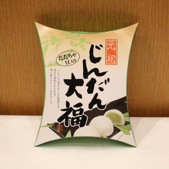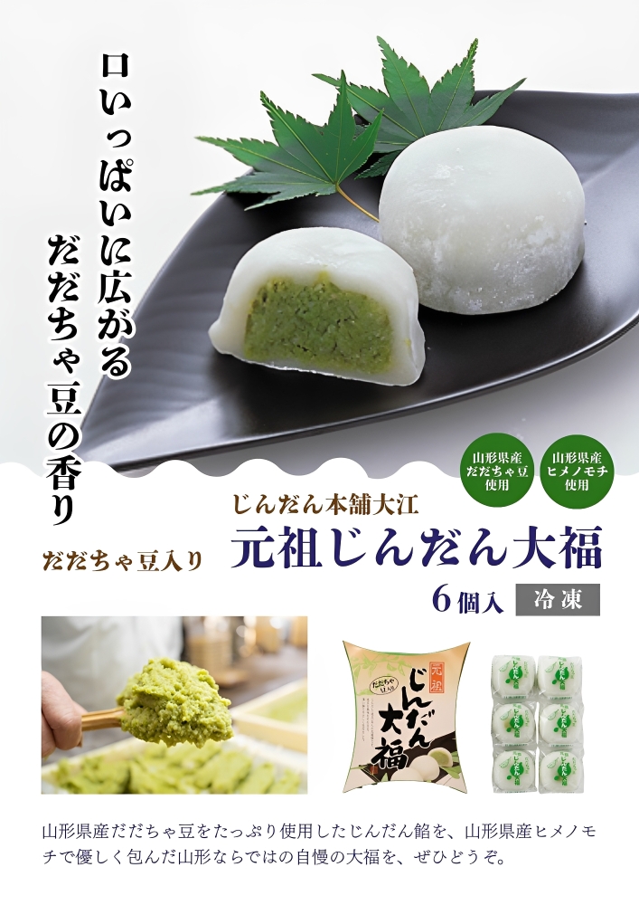 山形名物「じんだん」をたっぷり包み込んだ、じんだん本舗大江の看板商品『じんだん大福』。