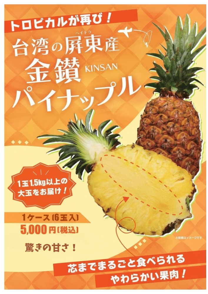 台湾パインの最高傑作「金鑚(きんさん)パイナップル」。最大の驚きは、芯までサクサク食べられる柔らかさです。酸味が少なく、ハチミツのように濃厚な甘みが口いっぱいに広がります。パイナップル特有の舌のピリピリ感もほとんどありません。一度食べれば、これまでの常識が変わるはず。