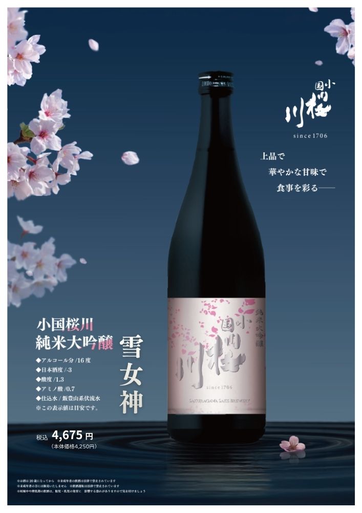 飯豊連峰の清冽な伏流水で仕込まれたその雫は、雪女神特有のしなやかな甘みと、桜川らしいキレの良さが完璧に調和。まるで新雪のように雑味のない透明感と、気品あふれる華やかな香りが口いっぱいに広がります。雪国小国の美しさを凝縮した逸品です。