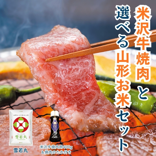【内容量】米沢牛焼肉用(肩・カルビ)400g×1、焼き肉のたれ×1、山形のお米2kg(つや姫または雪若丸からお選びください)