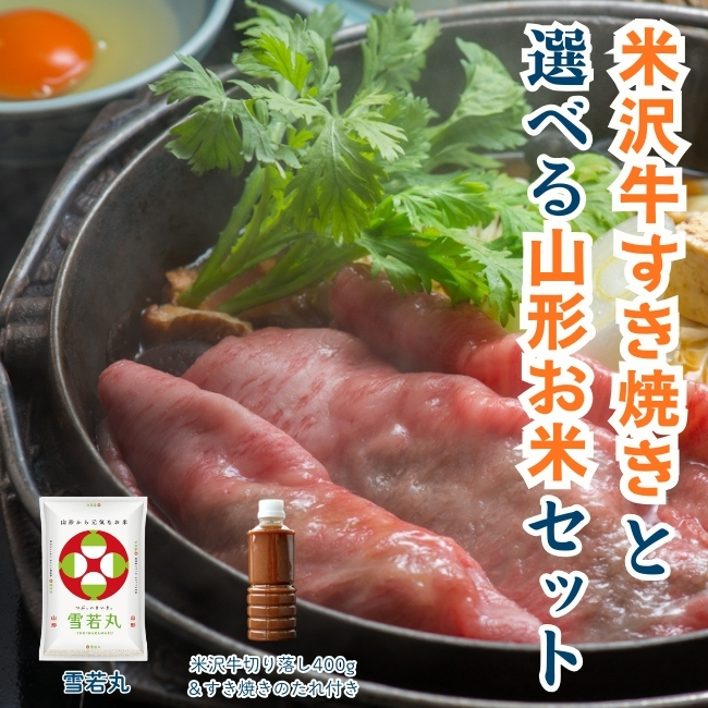【内容量】米沢牛すき焼き用切り落とし400g×1、すき焼きのたれ×1、山形のお米2kg(つや姫または雪若丸からお選びください)