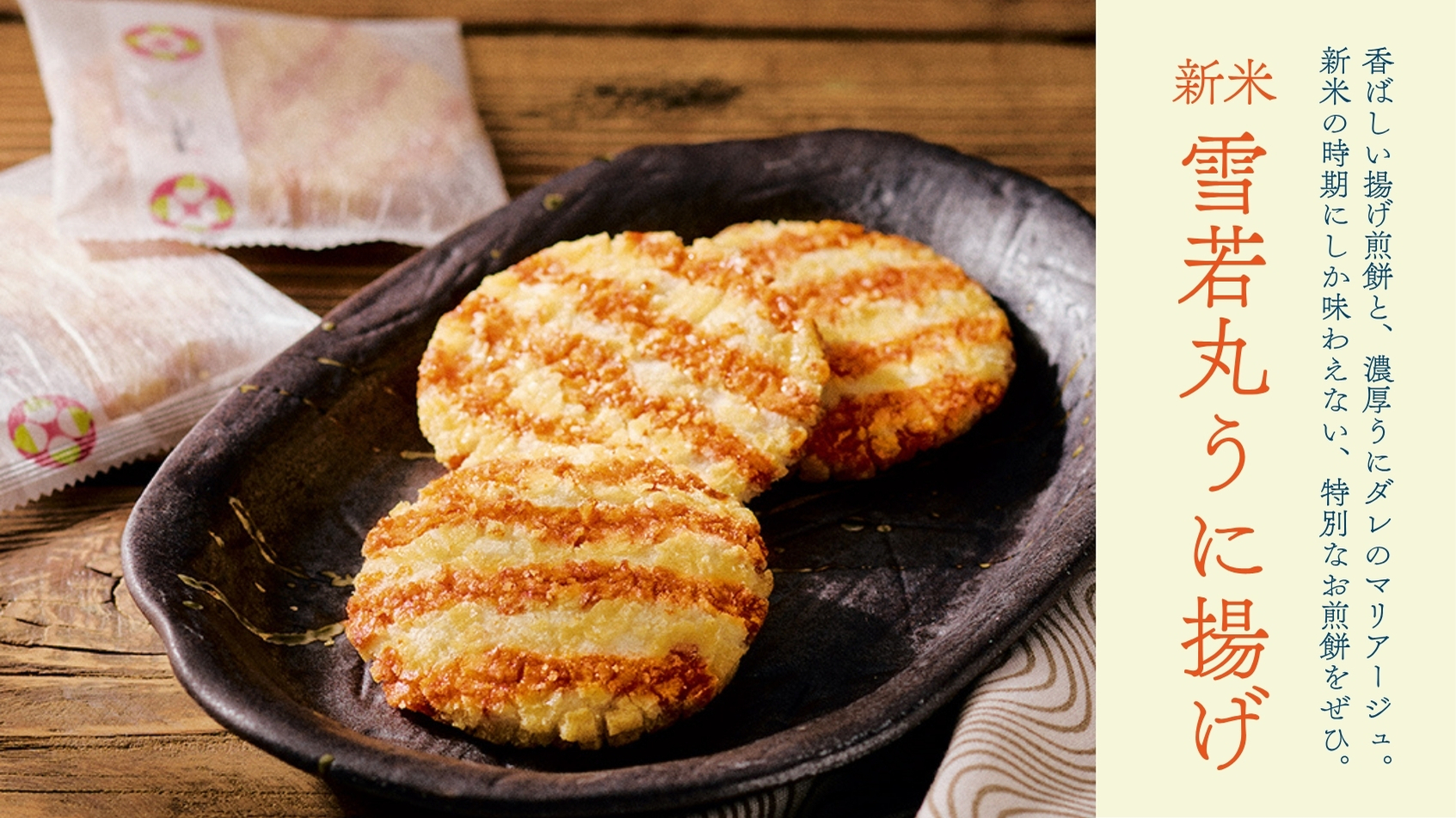 煎餅工房さがえ屋がお届けする秋の限定品「新米雪若丸うに揚げ」は、山形県が誇るブランド米「雪若丸」の新米を贅沢に使用した、数量限定の揚げせんべいです。