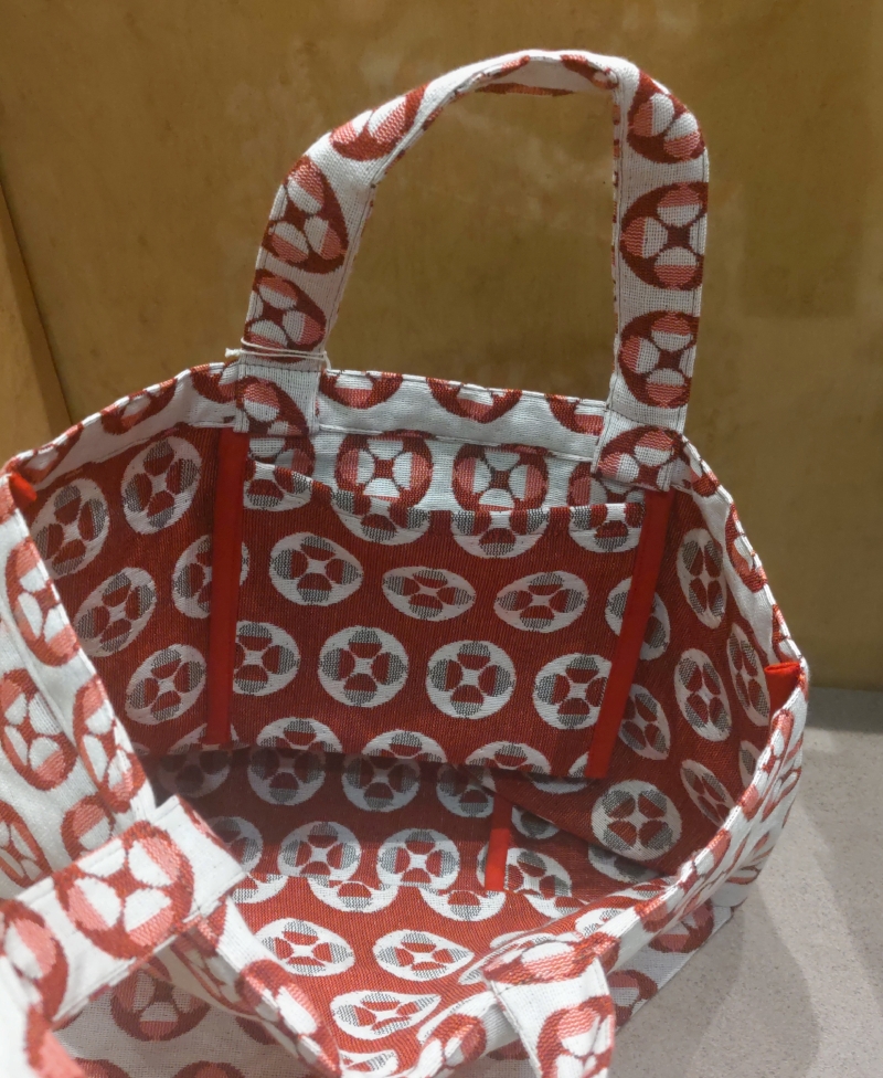 お弁当箱を持ち運ぶのに最適な、しっかりとした帆布に近い厚みの織物バッグ。持ち手までしっかりと米織生地で作られており非常に丈夫で、自立するタイプのトート型バッグです。