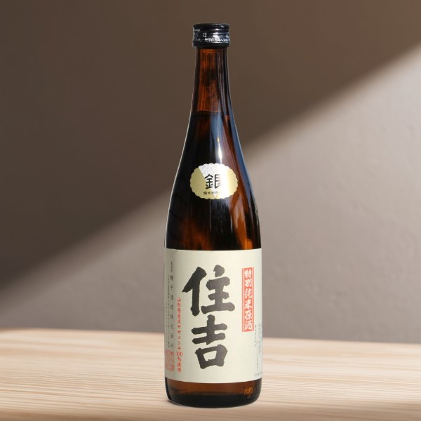 「特別純米原酒 銀・住吉」は、山形県産ササニシキを100%使用し、吉野杉の甲付樽で芳醇な木香をまとわせた逸品です。